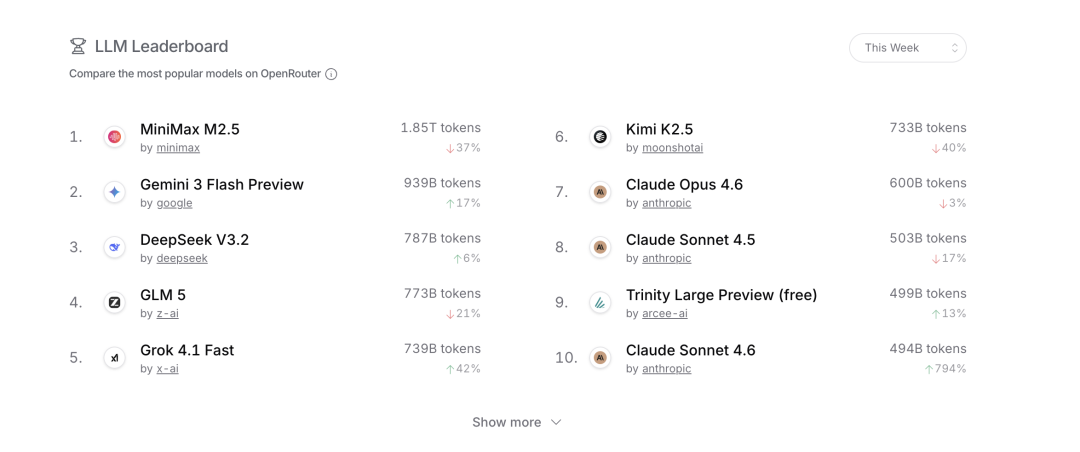 2026 年 2 月 24 日,OpenRouter 发布了一份周度数据:平台前十模型的总 Token 消耗约 8.7 万亿,中国模型独占 5.3 万亿,占比 61%。MiniMax M2.5 以 2.45 万亿 Token 空降榜首,Kimi K2.5、智谱 GLM-5 紧随其后,前三名清一色来自中国。