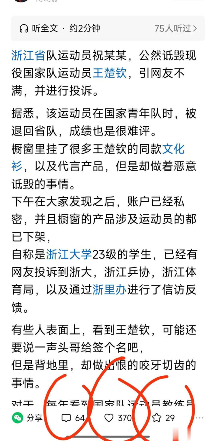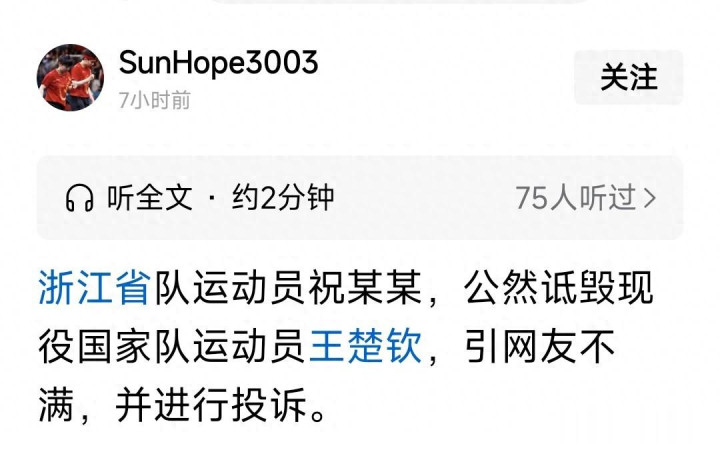 某位有3.4万粉丝的博主发文称:祝佳祺诋毁王楚钦被投诉……然后,整篇文章反复批评祝佳祺。