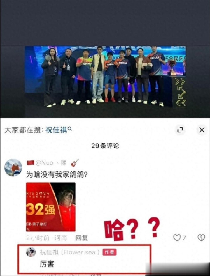 事件的起因是,浙江省运动员祝佳祺发布自己参加张继科杯团体赛的比赛视频,有网友评论区发布了一张王楚钦巴黎奥运男单32强的照片,并配文:为啥我家鸽鸽没来?
