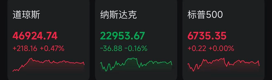 当地时间10月21日,美股三大指数涨跌不一,道指续创新高。截至收盘,道指涨218.16点,涨幅0.47%,报46924.74点;纳指跌36.88点,跌幅0.16%,报22953.67点;标普500指数接近收平,报6735.35点。