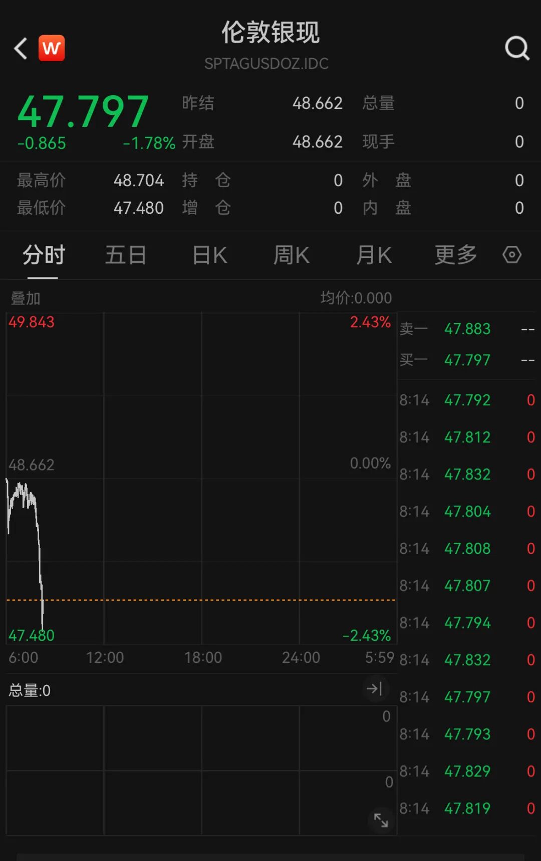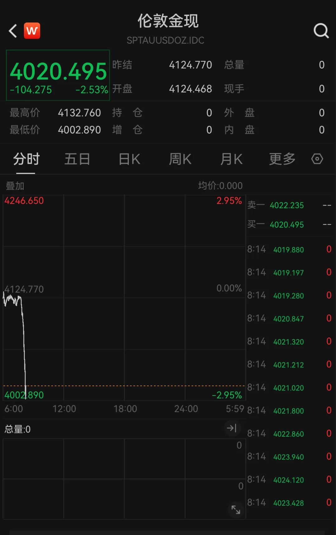 隔夜,国际金价、银价大跌。伦敦现货黄金跌超5%,报4124.355美元/盎司,盘中一度创自2013年4月以来的最大单日跌幅;伦敦现货白银跌逾7%,报48.662美元/盎司,盘中一度创下自2021年以来的最大跌幅。