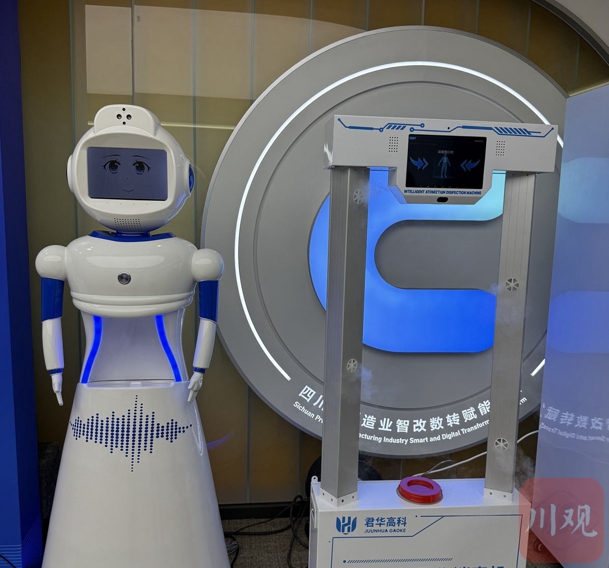 工作人员只需经过人脸识别,将手背置于检测区,食品安全晨检机器人便迅速完成了体温测量和手部卫生状况分析……会场外,君华高科集团有限公司带来的晨检机器人、消毒机器人、智能留样柜等智能设备吸引了众人目光。